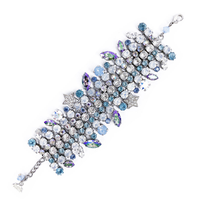Bracciale Sogno di Mezzanotte. Ogni pietra racconta un frammento di sogno: i blu del cielo, i viola della magia, i bagliori iridescenti della scarpetta della giovane principessa. Le stelle scintillanti sono amuleti di fortuna, simboli di un desiderio che si avvera.