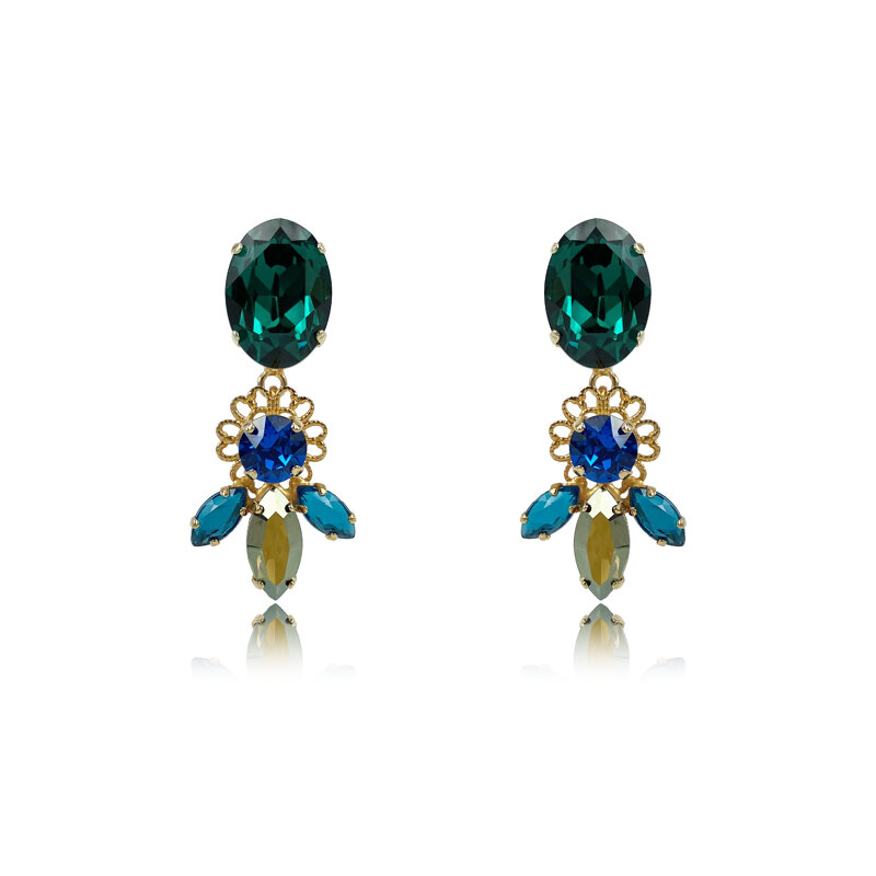 Colors: Gold, emerald, blue zircon, iridescent green and capri blue.