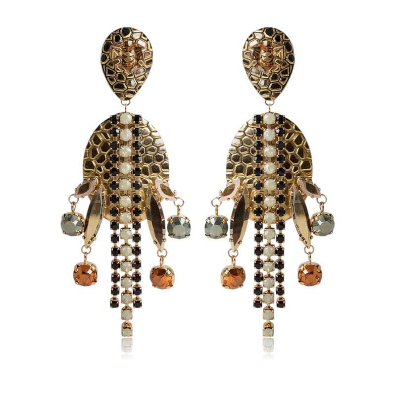 Gli orecchini Nairobi Animalier XL incarnano l’anima selvaggia e raffinata dell’Africa più autentica. Realizzati artigianalmente in ottone dorato 24 kt e impreziositi da cristalli Swarovski nelle tonalità del miele e dell’ambra, questi gioielli evocano la luce dorata della savana al tramonto.