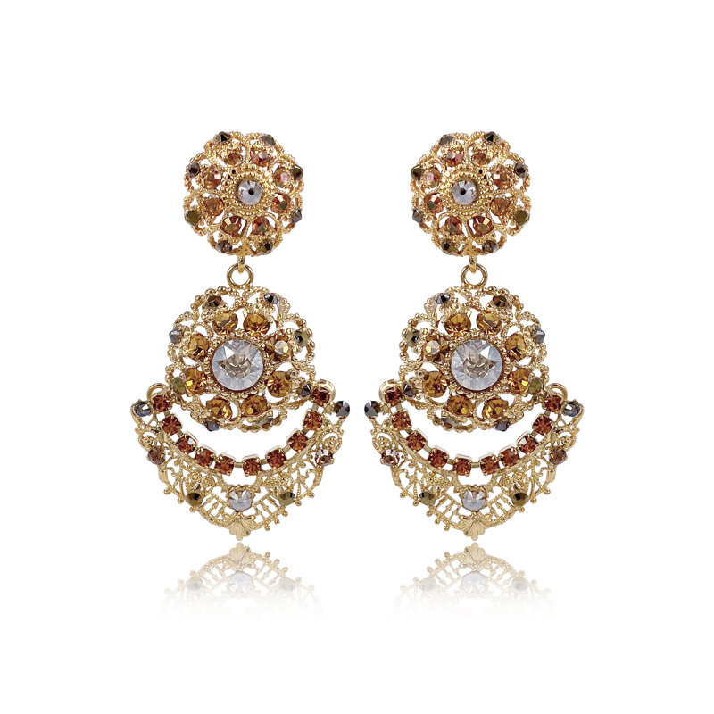 Il design barocco e sofisticato, impreziosito da raffinati dettagli traforati e pendenti, dona movimento e luce al viso, rendendo questi orecchini perfetti per le occasioni speciali o per dare un tocco glamour ad un outfit semplice ma elegante.